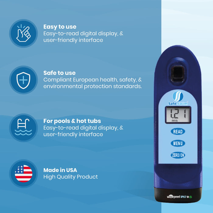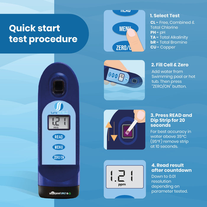 For Swimming Pool and Hot Tub owners, as well as Pool Professionals, who are looking for an economical way to test water quality, the Safe Swim® Meter is the perfect solution. This innovative kit provides accurate results for seven essential water parameters, ensuring that the pool or hot tub water is maintained at optimal levels.